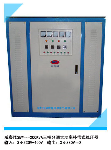 威泰隆SBW-F-200KVA分调式大功率稳压器 威泰隆SBW系列三相全自动自动补偿式电力稳压器,是我公司引进吸收西欧先进技术,同时结合我国国情,为稳定交流电压而设计。当外界的供电网络电压波动或负载变化而造成电压波动时,能自动保持输出电压的稳定。 本系列产品与其他形式稳压器相比具有容量大,效率高,无波形畸变,电压调节平衡等优点,适用于负载广泛,能承受瞬时超载,可长期连续工作,手动/自动随意转换,设有过压、过流、缺相、相序保护及机械故障自动保护,以及体积小、重量轻、使用安装方便,运行可靠等优点。 采用三相分调式设计,有效解决用电场所输入电压不平衡影响输出电压。每相独立采样,独立调节,互不干扰。